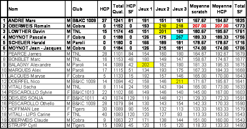 Romain Oberweis spielte sich in der Einzelwertung beträchtlich nach oben mit einem Endresultat von 2158 Pins gleich 239,78 Schnitt inklusive Handicap. In der Scratch Wertung waren dies sensationelle 1978 Pins mit 219, 79 Schnitt was ihn zu einem sicherlich Verdienstvollen 3. Platz brachte.