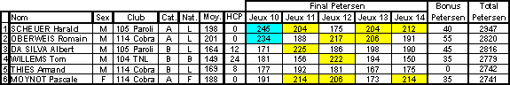 | 4 | 23 | PASQUALONE Henri | M | 105 | Paroli | A | S | SA | F | 180 | X | X | 195 | 193 | 199 | 257 | 160 | 185 | 1189 | 198 | |||