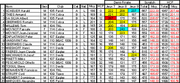 Richy Griesinger landete mit 1994 Pins auf Platz 37, Alain Lieners mit 1893 Pins auf Platz 75, Pierrot Emeringer mit 1797 Pins auf Platz 99. In der Einzelwertung waren 370 Spieler gewertet worden. (297 Herren und 73 Damen)